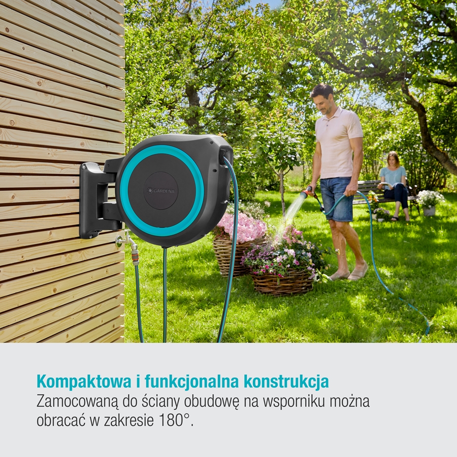 Zapraszamy do zapoznania się z bębnem naściennym RollUp L, który umożliwi wygodne i efektywne nawadnianie dużych ogrodów. Dzięki temu produktowi podlewanie roślin stanie się znacznie łatwiejsze i wygodniejsze. Bęben montowany jest na ścianie za pomocą mocowania naściennego i podłączany do kranu przy użyciu węża przyłączeniowego. Wąż o długości 30 m i możliwości obrotu w zakresie 180° zapewnia użytkownikowi maksymalną swobodę ruchu podczas podlewania. Po zakończeniu pracy, wbudowana sprężyna stalowa automatycznie zwija wąż, a innowacyjna technologia RollControl dba o staranne ułożenie węża. Bęben wykonano z wysokiej klasy materiałów, odpornych na warunki atmosferyczne, dzięki czemu może pozostawać na ścianie przez cały rok. Produkt jest wyposażony w wszystkie niezbędne elementy, w tym mocowanie naścienne, wąż przyłączeniowy, zraszacz z dwiema opcjami strumienia wody oraz konieczne elementy Original GARDENA System. Bęben jest również zabezpieczony przed kradzieżą, a GARDENA oferuje pięcioletnią gwarancję na ten produkt. Dzięki RollUp L podlewanie dużego ogrodu staje się prostsze, wygodniejsze i bardziej efektywne.