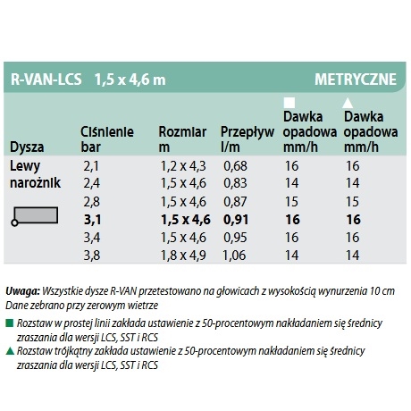 Niskoprzepływowa dysza rotacyjna R-VAN LCS o prostokątnym zasięgu 1,5 x 4,6 m (lokalizacja lewy narożnik) Rain Bird to innowacyjne rozwiązanie poszerzające asortyment zraszaczy rotacyjnych o kolejne, niedostępne wcześniej zasięgi. Dysza posiada idealną proporcję wydatku wody do możliwości absorpcyjnych gleby. Dzięki zastosowaniu dysz rotacyjnych użytkownik oszczędza do 60% wody, dzięki precyzji pokrycia pozwalającej znacznie skrócić czas nawadniania oraz zmniejszonemu przepływowi. Pracująca dysza tworzy grube strumienie wody, które są wyjątkowo odporne na podmuchy wiatru. Regulacja dyszy nie wymaga żadnych dodatkowych narzędzi.