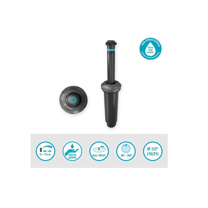 Ergonomiczna konstrukcja zraszacza umożliwia regulację zasięgu nawadniania w zakresie 5-7,5 m oraz sektora nawadniania od 80° do 360° – wszystko to bez użycia narzędzi. Dzięki temu zraszacz dostosuje się do kształtu Twojego ogrodu, zapewniając równomierne nawadnianie.
